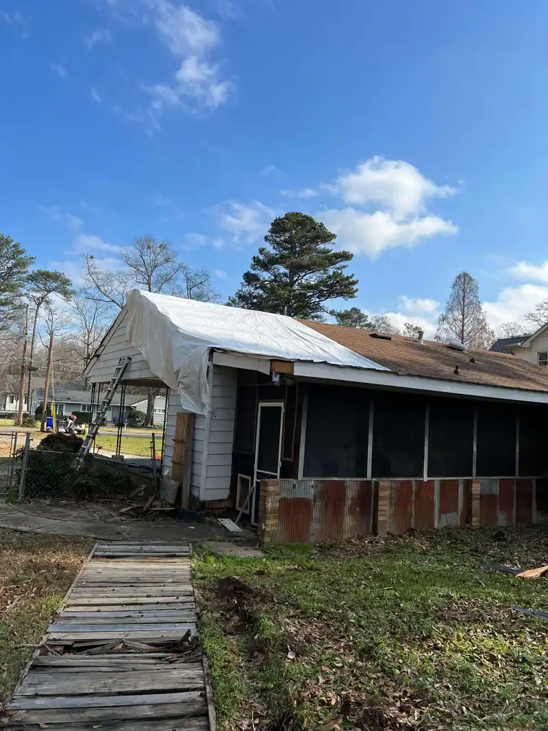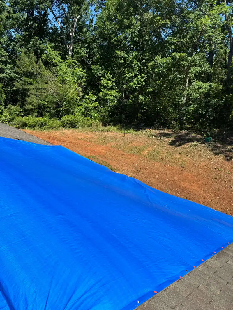 A large blue tarp is spread over part of a sloped rooftop, with a dirt yard and dense green trees in the background—ideal for those seeking tree services Cherokee, GA, or tree removal Cherokee under the bright sunlight.