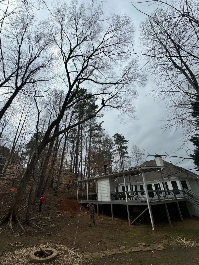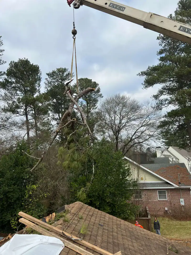 A large fallen tree is being lifted off a residential roof by a crane, with branches and debris visible. People are standing nearby as tree removal Cherokee, GA professionals work, while houses and tall trees stand in the background.