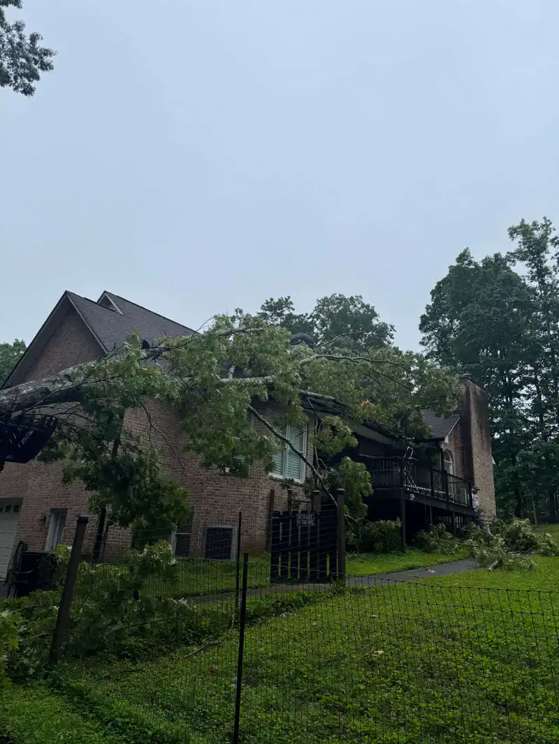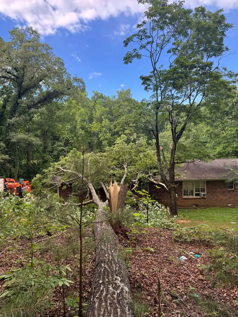 A large tree has fallen and split near its base, landing across a yard and damaging the roof of a brick house. Utility workers and trucks are visible in the background, likely assisting with tree removal Cherokee, GA.