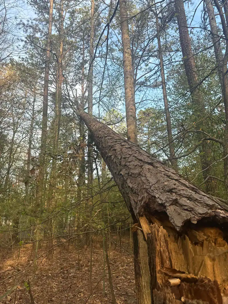 A partially broken tree leans against others in a forest, its trunk split and jagged at the base. Sunlight filters through the canopy above, highlighting the need for professional tree services Cherokee, GA to ensure safety and preserve nature’s beauty.