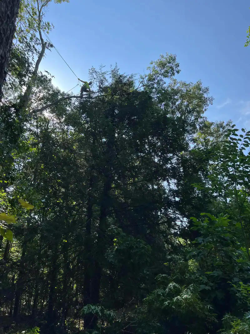 A person in safety gear is high up in a tall tree among dense green foliage, with bright sunlight and a clear blue sky—showcasing expert tree removal Cherokee, GA trusts.