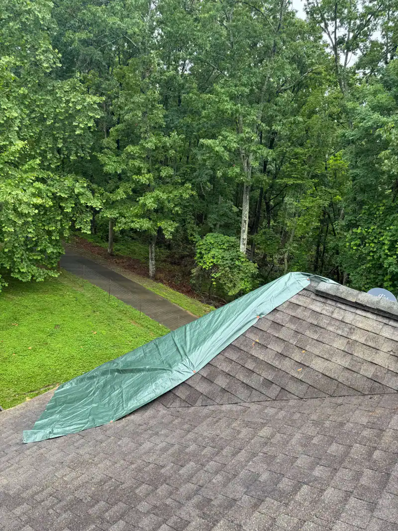 A green tarp is spread across the ridge of a shingled roof, covering part of it. In the background, green trees and a driveway run through a grassy yard—ideal for those in GA seeking tree services Cherokee for their property needs.