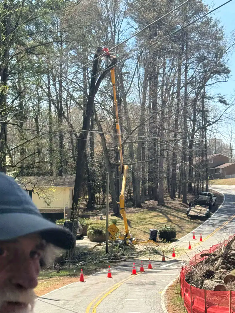A worker in a yellow lift trims branches near power lines on a wooded residential street, highlighting professional tree services Cherokee, GA. Traffic cones block the road, and a man’s face is visible in the lower left corner of the image.