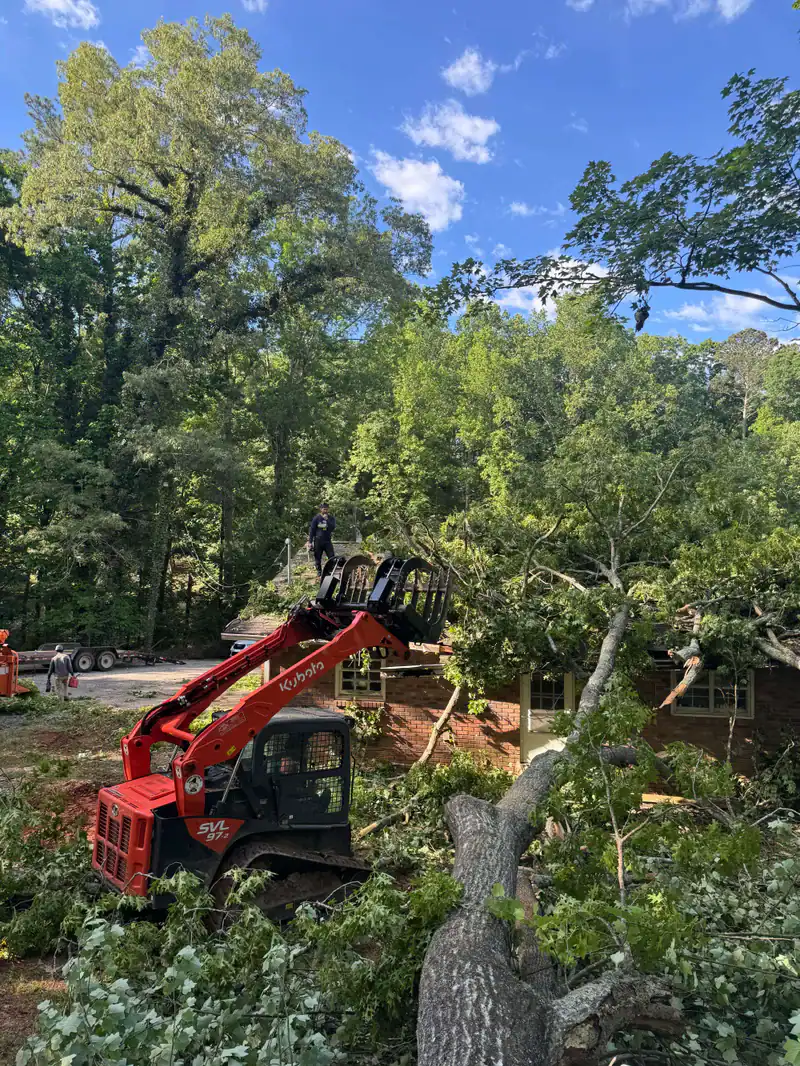 A worker stands on a red skid steer loader raised among large fallen tree branches in front of a house, showcasing expert tree removal Cherokee, GA, surrounded by dense green trees under a blue sky with clouds.