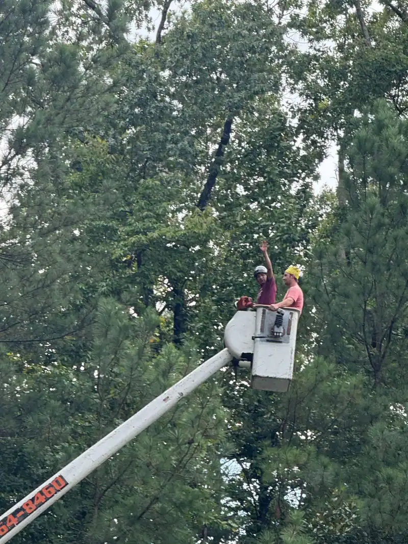 Two workers stand in the bucket of a cherry picker elevated among tall trees; one in a yellow hard hat, the other raising an arm while looking upward—demonstrating expert tree services Cherokee, GA.