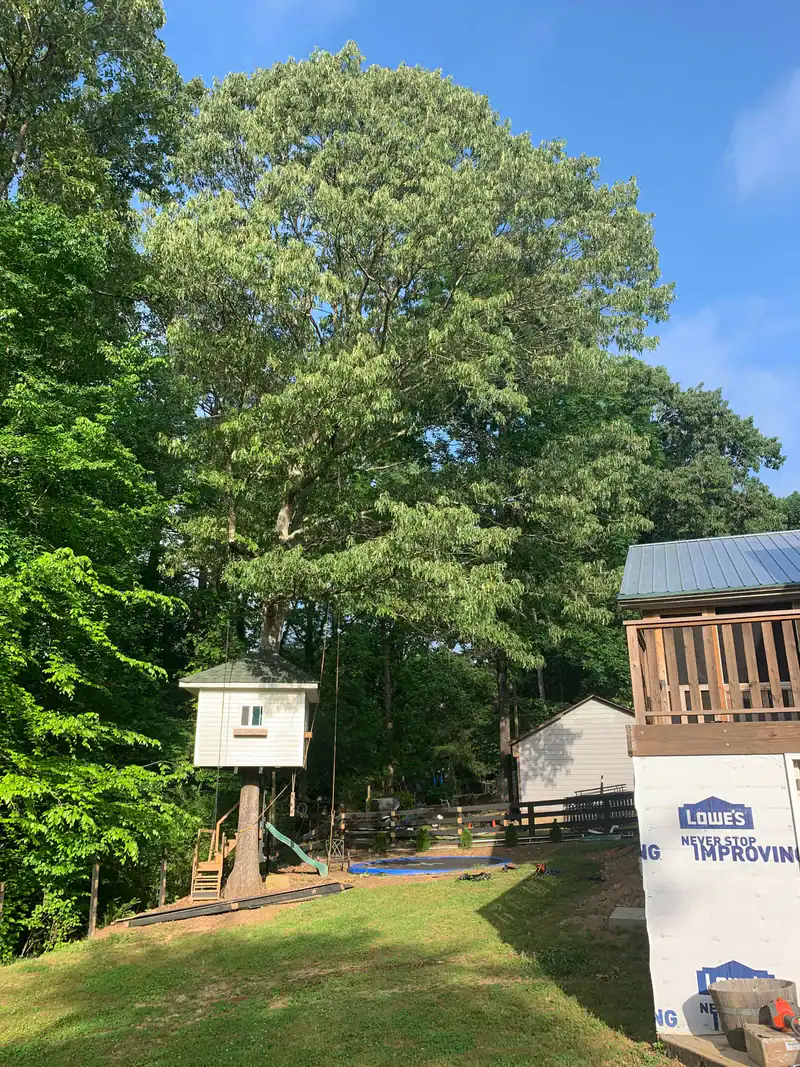 A backyard with a green lawn, large leafy trees serviced by tree services Cherokee, a white treehouse on stilts with a slide and swing, a wooden deck, and a partially constructed structure covered in Lowe’s wrapping.