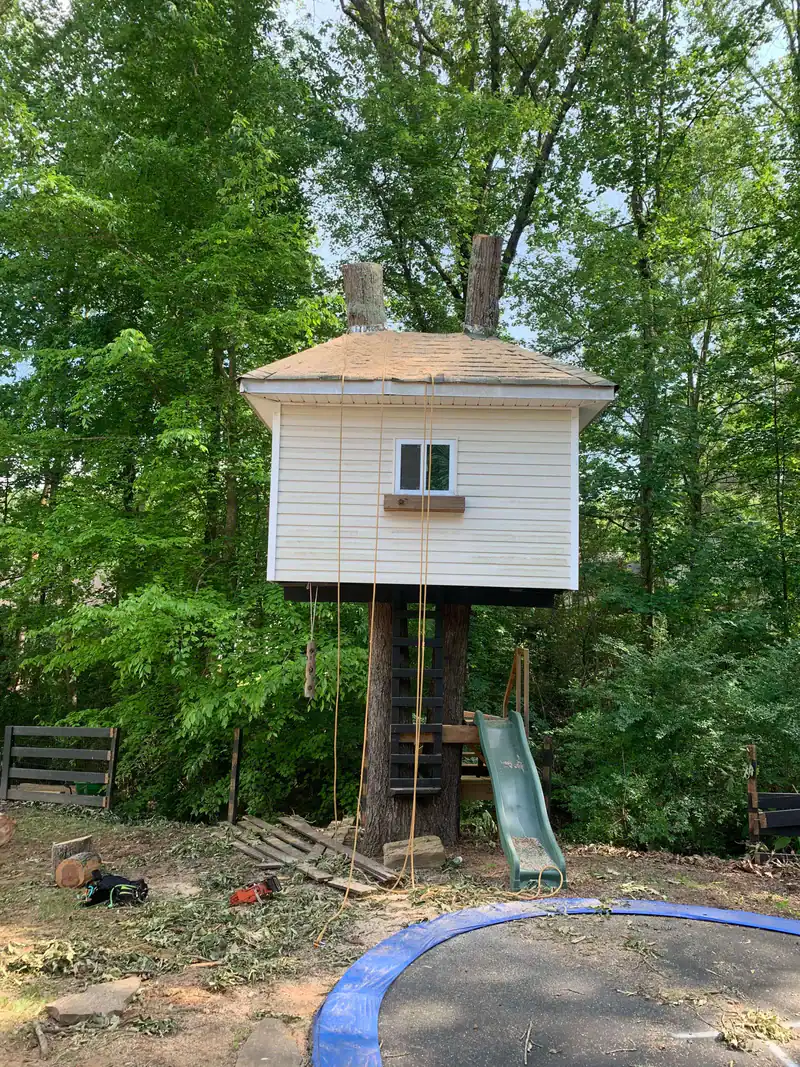 A white treehouse with a small window sits elevated on tree trunks in a wooded backyard. A slide and rope swing hang from the structure, with a trampoline below—perfect for families seeking tree services in Cherokee, GA.